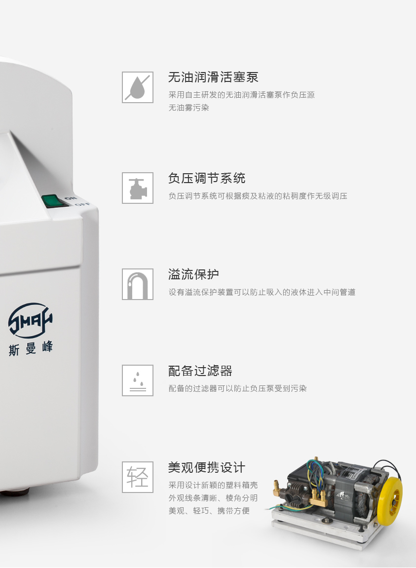 2、 负压调节系统可根据痰及粘液的粘稠度作无级调压;