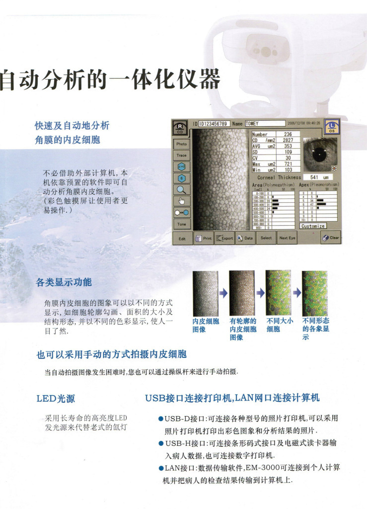 产品特性: 3. 连续拍摄15次,选取佳图象 4. 宽阔的照相范围 5. 可自行选取角膜上7个位置进行分析 6. 全自动快速分析,节省时间 7. 多项显示功能,一目了然 8. 采用长寿命高亮度LED光源 |