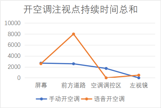 ① When completing the task of turning on the air conditioner and navigating, the total gaze time of the voice control is always greater than that of the touch control. When completing the task of turning on the air conditioner, the total gaze time of the voice control (11068ms) is 1.6 times that of the total gaze time of the touch control (6963 ms), indicating that the efficiency of voice control is lower than that of touch control when completing the task of turning on the air conditioner and navigating.