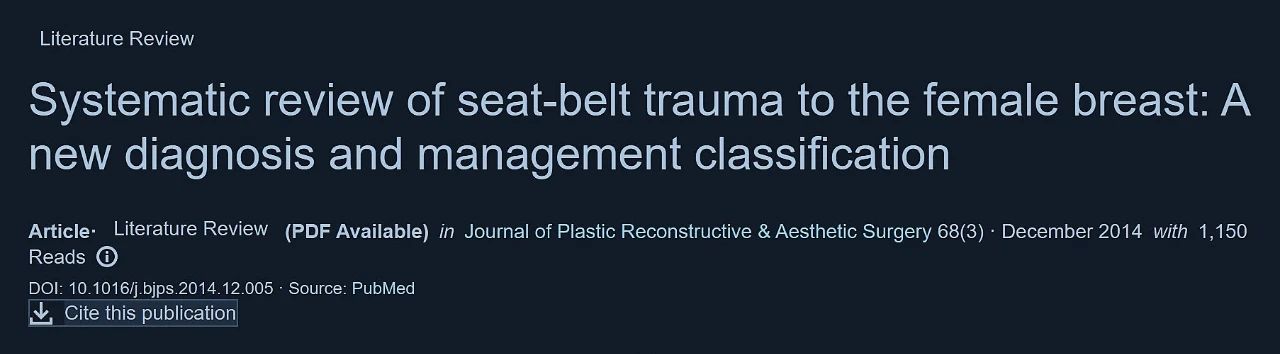In the medical paper A Systematic Review of Female Seat Belt Trauma: A New Diagnostic and Management Classification, 31% of patients reported experiencing pain, swelling, open wounds, or local bleeding immediately after a road traffic accident. 69% of patients experienced delayed onset of symptoms, ranging from 3 weeks to 5 years, ranging from a visible mass at the trauma site to worsening fissure deformities, and most late reports were diagnosed with fat necrosis.