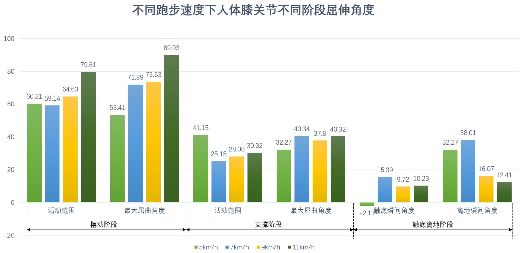 屈曲角度:9km/h、11km/h时的离地瞬间膝关节屈曲角度**小于5km/h、7km/h。在高速跑步中,首先高速跑步需要更快的腿部动作,减小膝关节的屈曲角度可以减小腿部摆动的幅度,减少腿部在空中摆动的时间,提高步频,增加跑步速度。