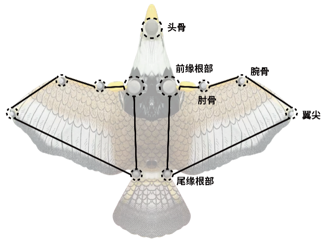 北京京显生物力学实验室的技术人员采用瑞典Qualisys动作捕捉系统以老鹰仿真模型为研究对象,对比分析仿真模型的飞行运动学特征。在实验对象的关键部位贴上具有反光特性的球状标记点,包括头骨、前缘根部、肘骨、腕骨、翼尖、尾缘根部。