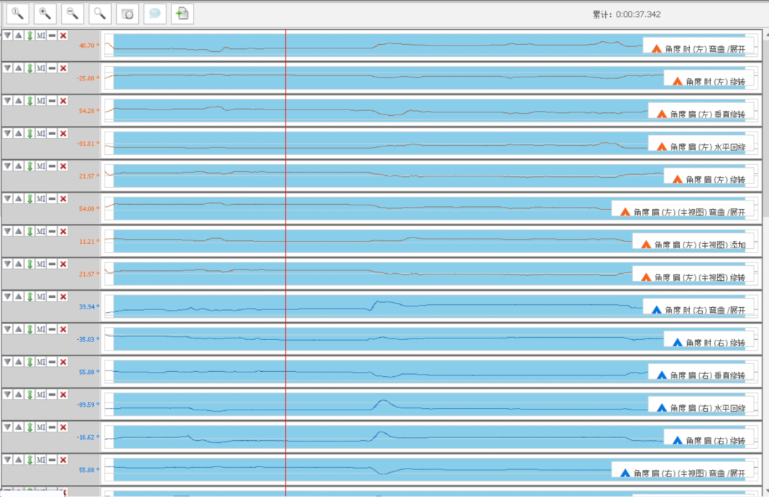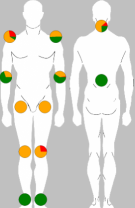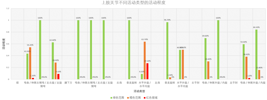 上图为关节活动分布图,图中不同颜色**固定的活动范围,以肩关节为例,垂直旋转活动中绿色表示0°-60°,橙色表示60°-90°,红色表示大于90°,其中绿色表示正常活动范围,红色**异常活动范围。