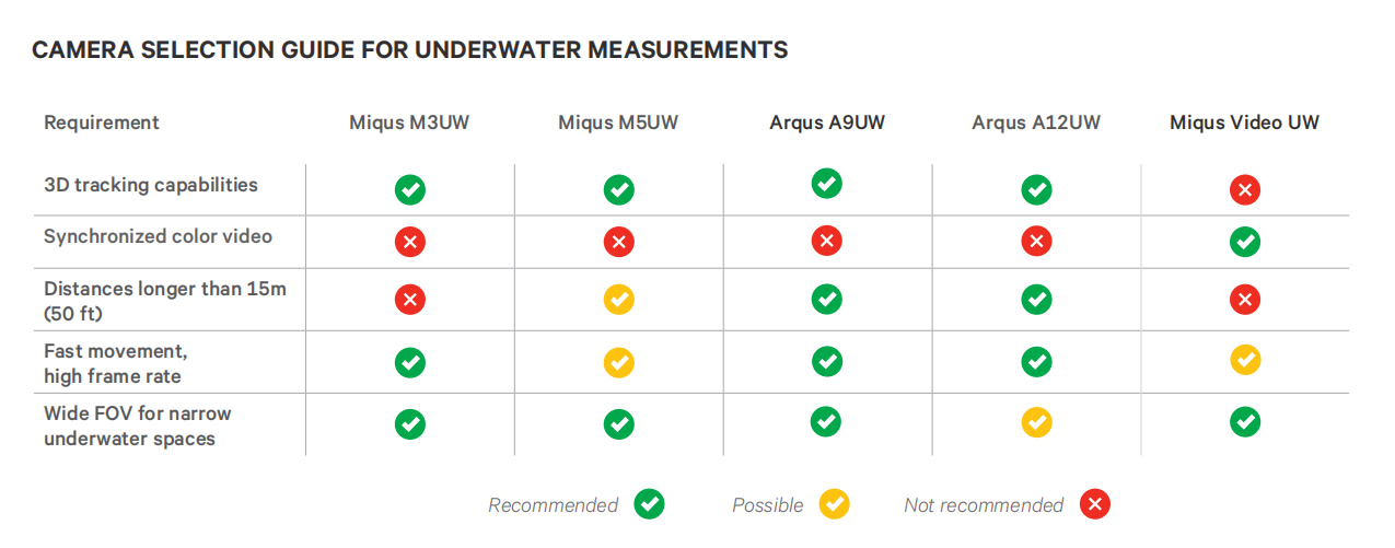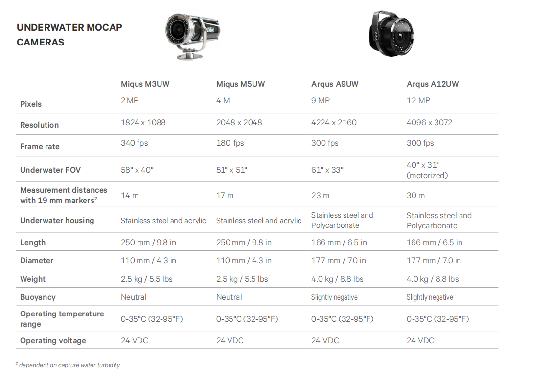 Miqus Underwater cameras are ideal to use in small to medium sized volumes, up to 15m (50ft) range.