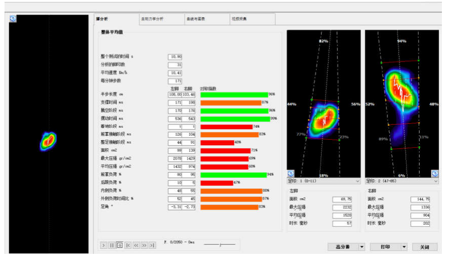 提供每一个脚印的基本测量数据,如接触面积、**受力、平均受力、持续时间。