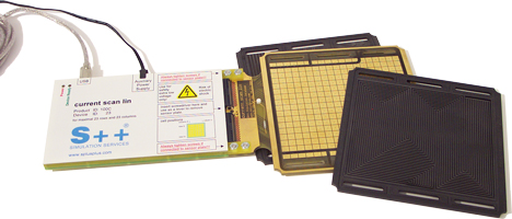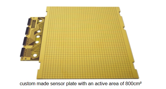 The above picture (by courtesy of Helion) shows a custom made sensor plate with an active area of 800cm² and 46 x 36 measurement cells. Nearly any design is possible. The minimal size of the measurement cells is 7 x 7mm. The maximal size is restricted by the current they have to measure and should not be much larger.