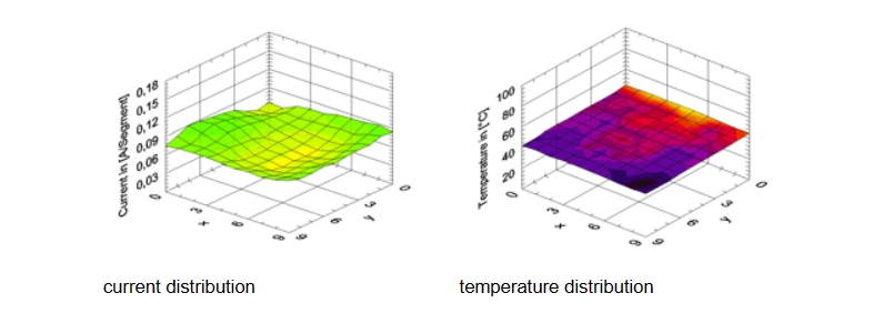 The device of type current scan lin shown befor has a resolution of 17 x 19 measurement cells and an active area of 150cm². It will be placed between the two halves of a bipolar plate at an arbitrary place in the stack. The pictures below show a typical current distribution and a temperature distribution.